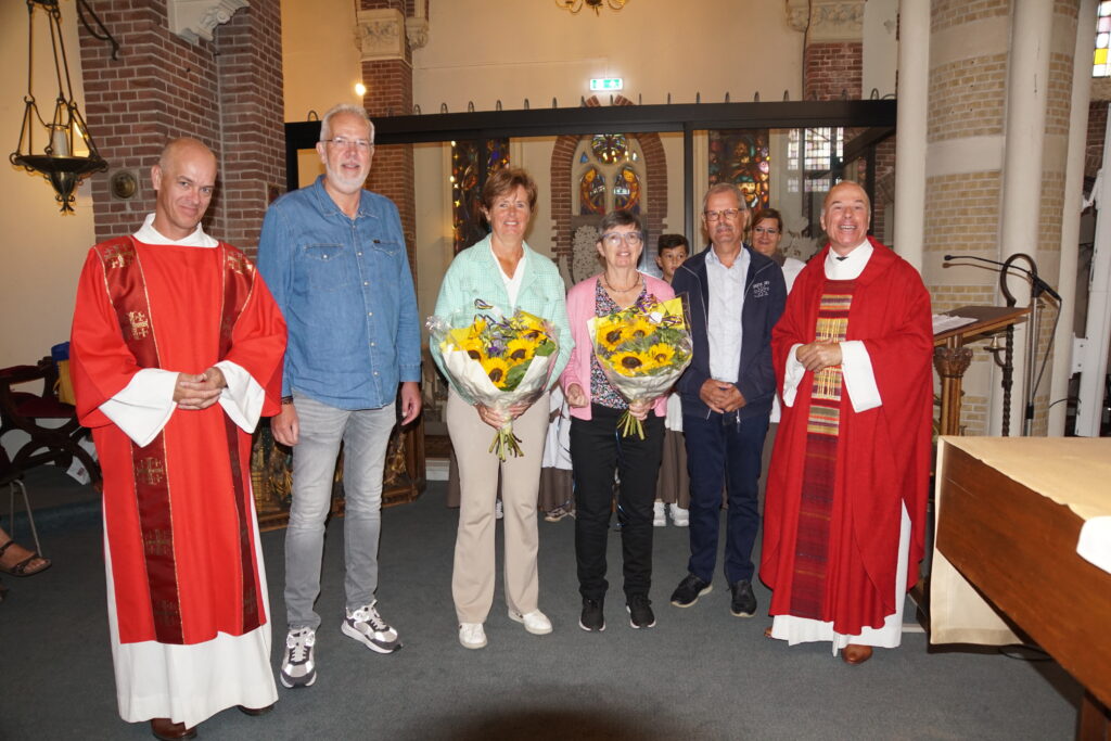De tekstgroep van het Middenkoor had een prachtige viering in elkaar gezet met passende teksten en liederen waarbij het thema: “De liefde overwint” centraal stond. Voor het Middenkoor was dit de eerste viering van dit werkjaar en zij hebben zich van hun beste muzikale kant laten horen. Aan het eind van de viering werd zoals gebruikelijk een werkgroep in het zonnetje gezet. Dit jaar was gekozen voor de Raphaëlgroep, bestaande uit Greet Hoek, Tineke van Bakel en Conny Kroon. Pastor Owel sprak de werkgroep toe met lovende woorden over het werk wat deze groep doet: aandacht hebben voor degene die een dierbare hebben verloren, voor hen een klein lichtpuntje zijn in moeilijke tijden. Pastor Owel noemde hen de “vleugels van de aartsengel Raphaël”. Als dank werden de werkgroepleden in de bloemetjes gezet en ontvingen zij een welverdiend applaus van de aanwezige parochianen.