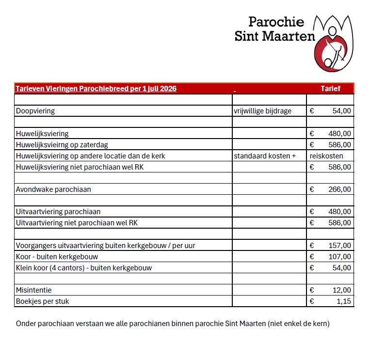 Tarieven Vieringen Parochie Sint Maarten Binnen de parochie Sint Maarten gelden per 1 juli 2026 parochiebreed de volgende tarieven.